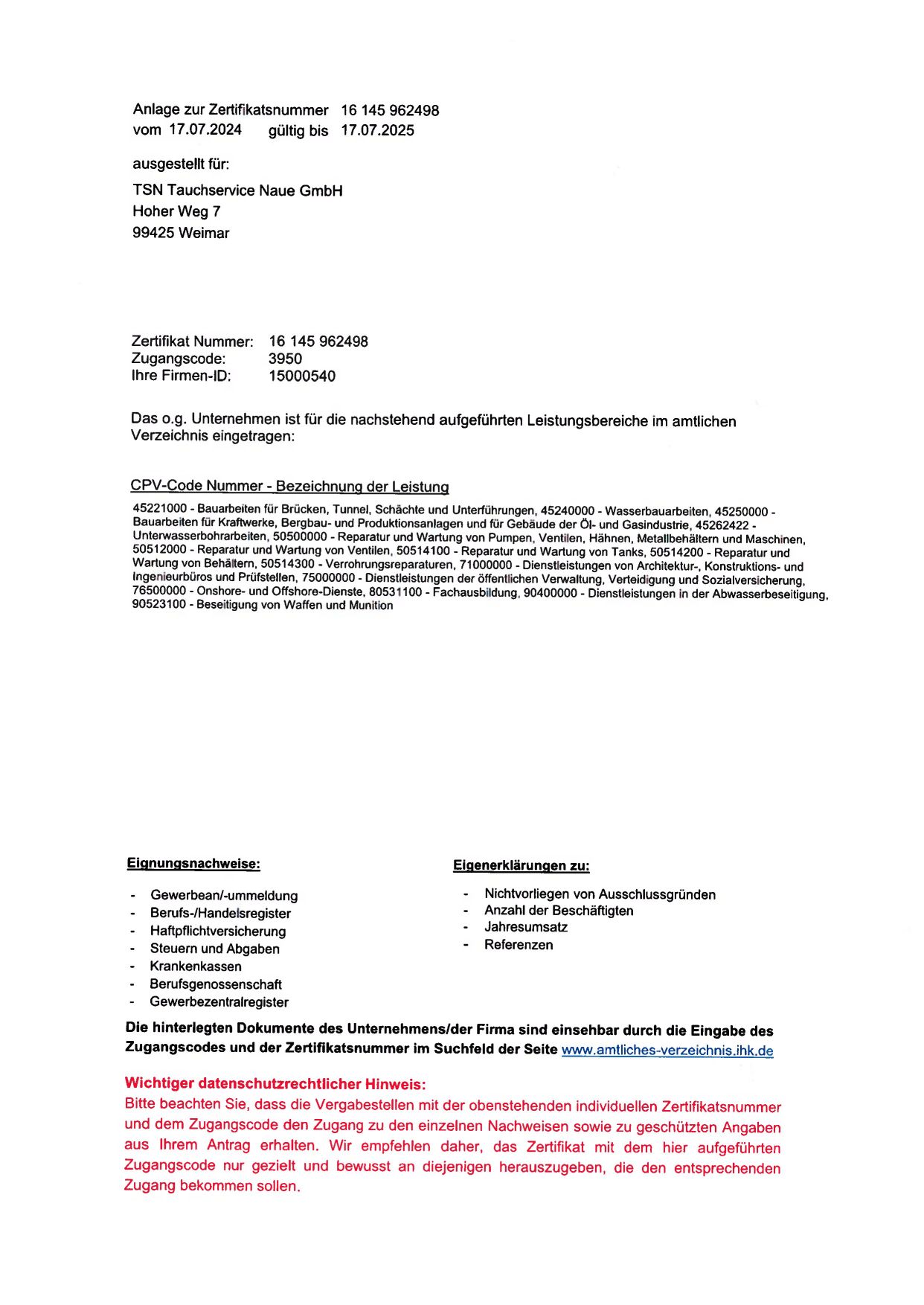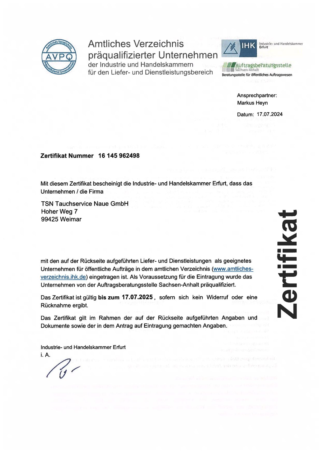 Zertifikat des amtlichen Verzeichnis präqualifizierter Unternehmen der IHK