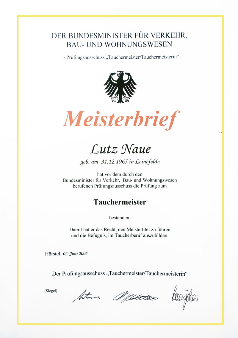 Meisterbrief Tauchermeister Lutz Naue