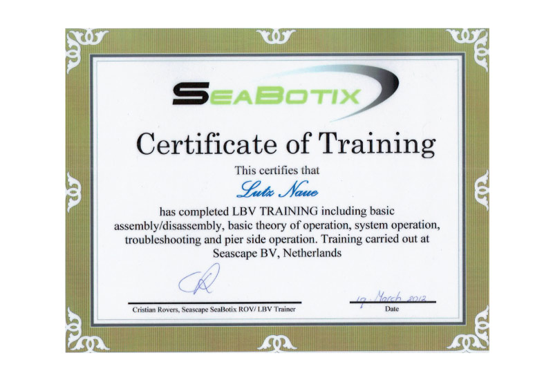 Lutz Naue besitzt das Certificate of Training von SeaBotix